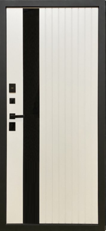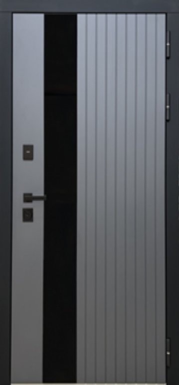 Металл: Порошково-полимерное покрытие, цвет Муар черный лист стали + ламинированная МДФ панель 10мм , цвет Графит Нубук + вставка из черного лакобеля + наличник Антрацит софт